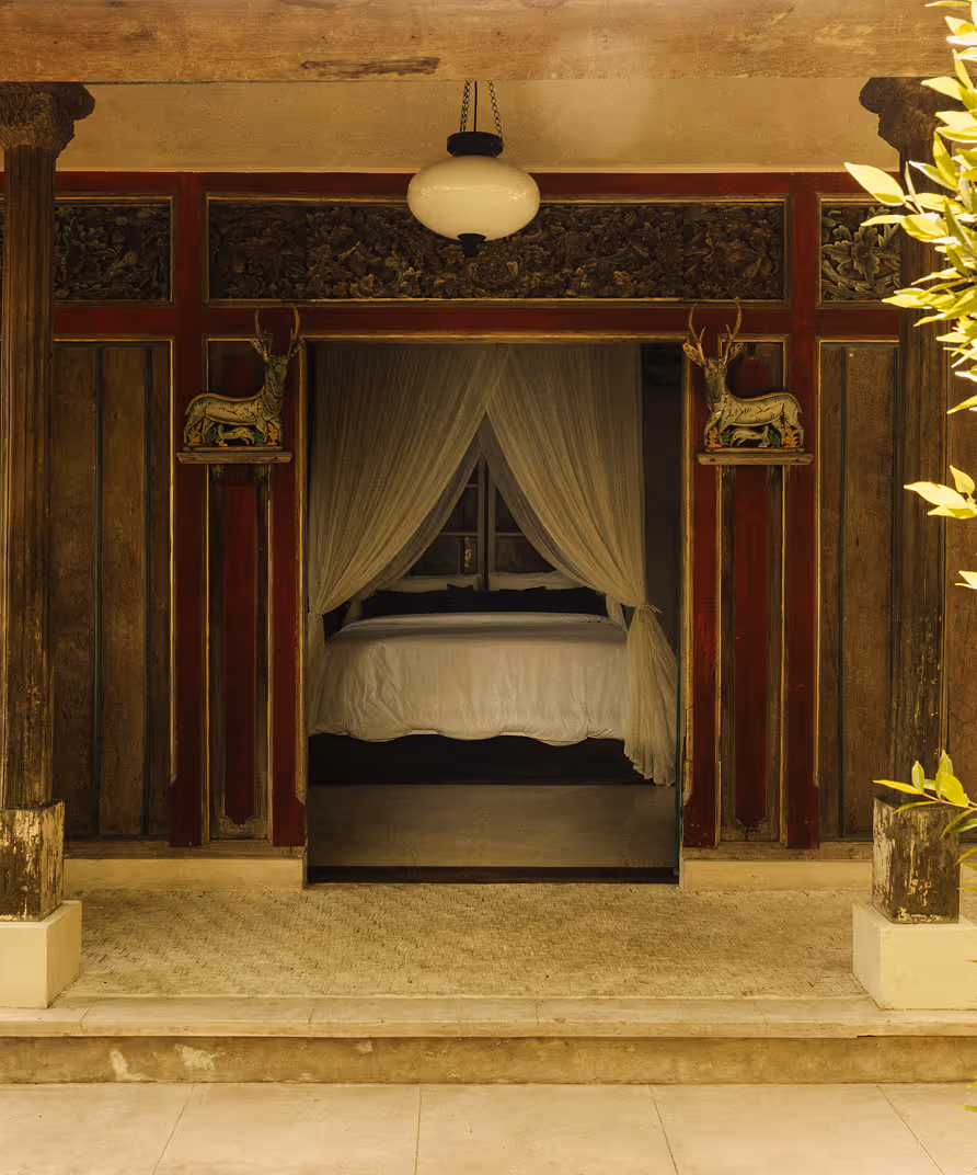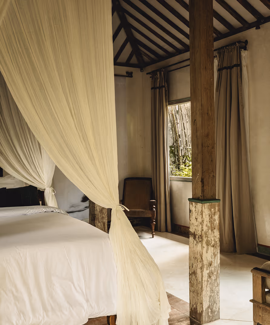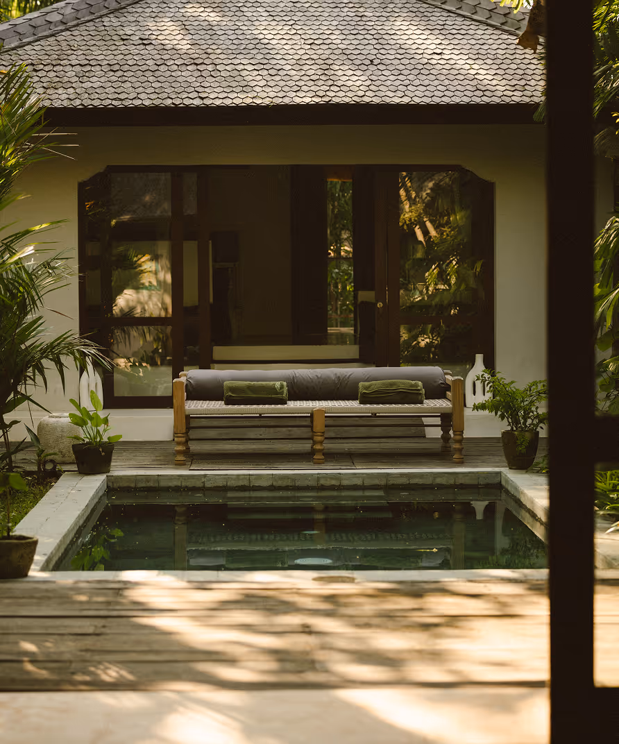 Our Master Bungalow is a private haven of space, privacy, and heritage design created by joining our two Pool Bungalows. Set around a shared pool, each bungalow includes a spacious open-air bathroom, wooden features, artisanal detailing and a four-poster bed. Ideal for families or friends, this space is a beautiful sanctuary for a meaningful and restorative time together.