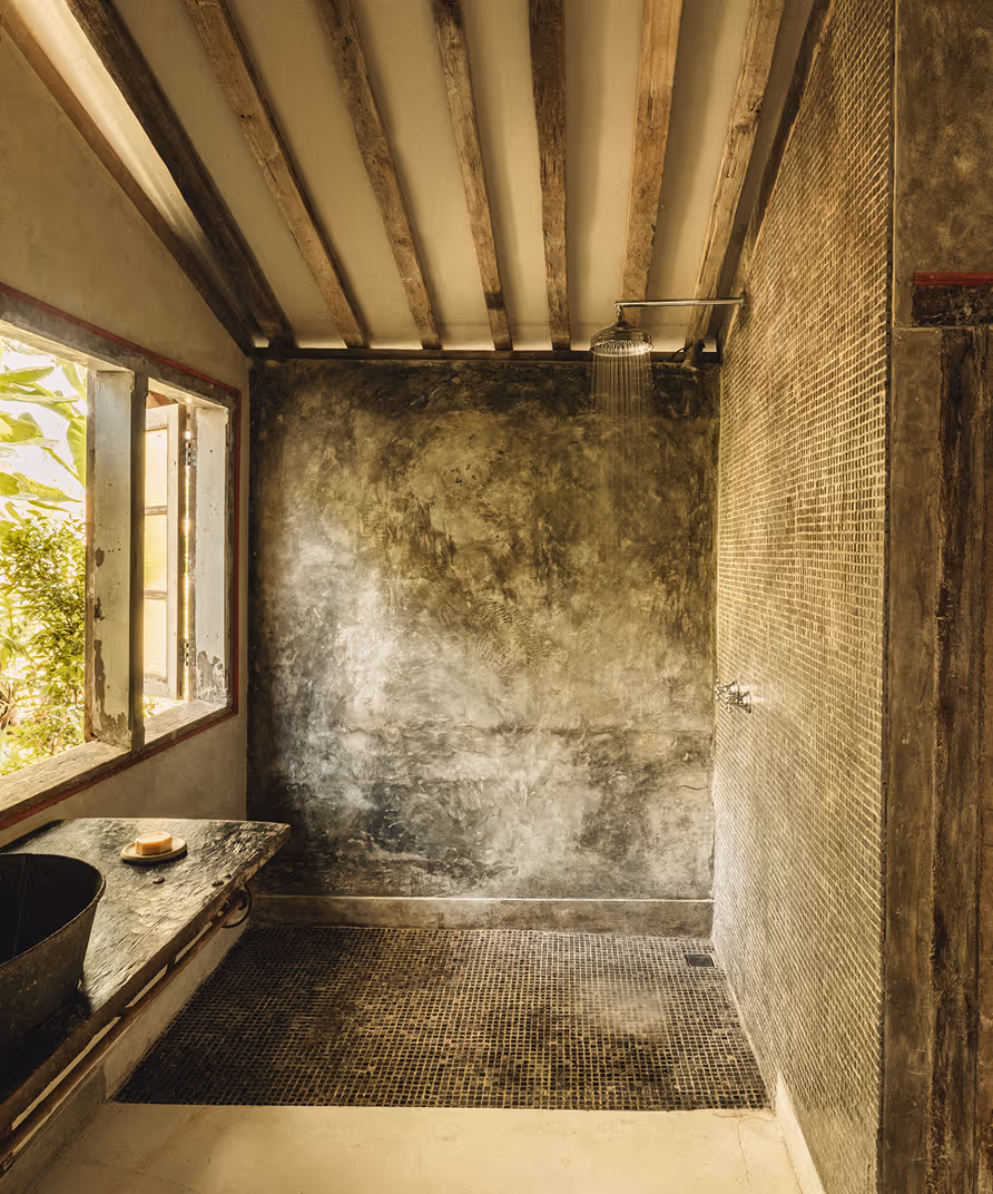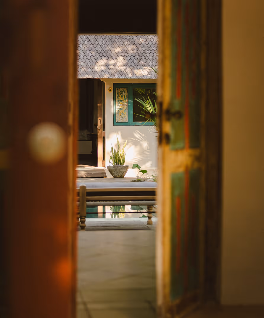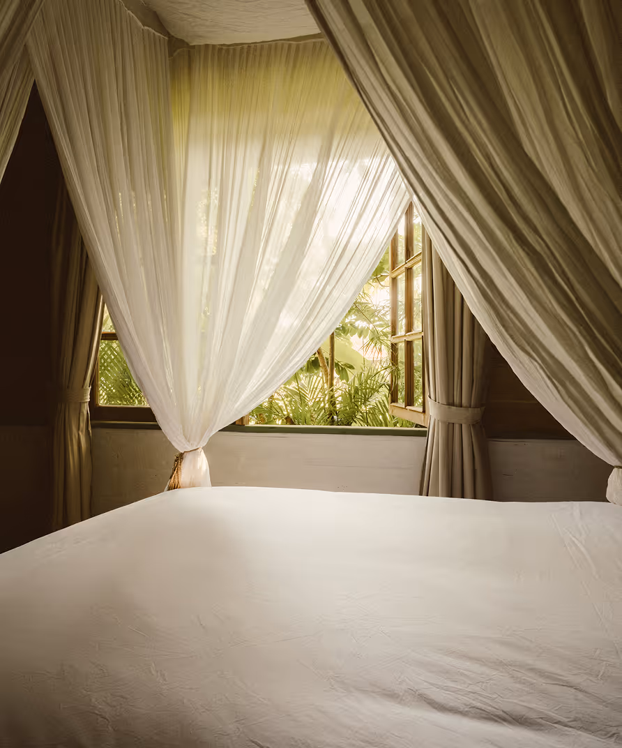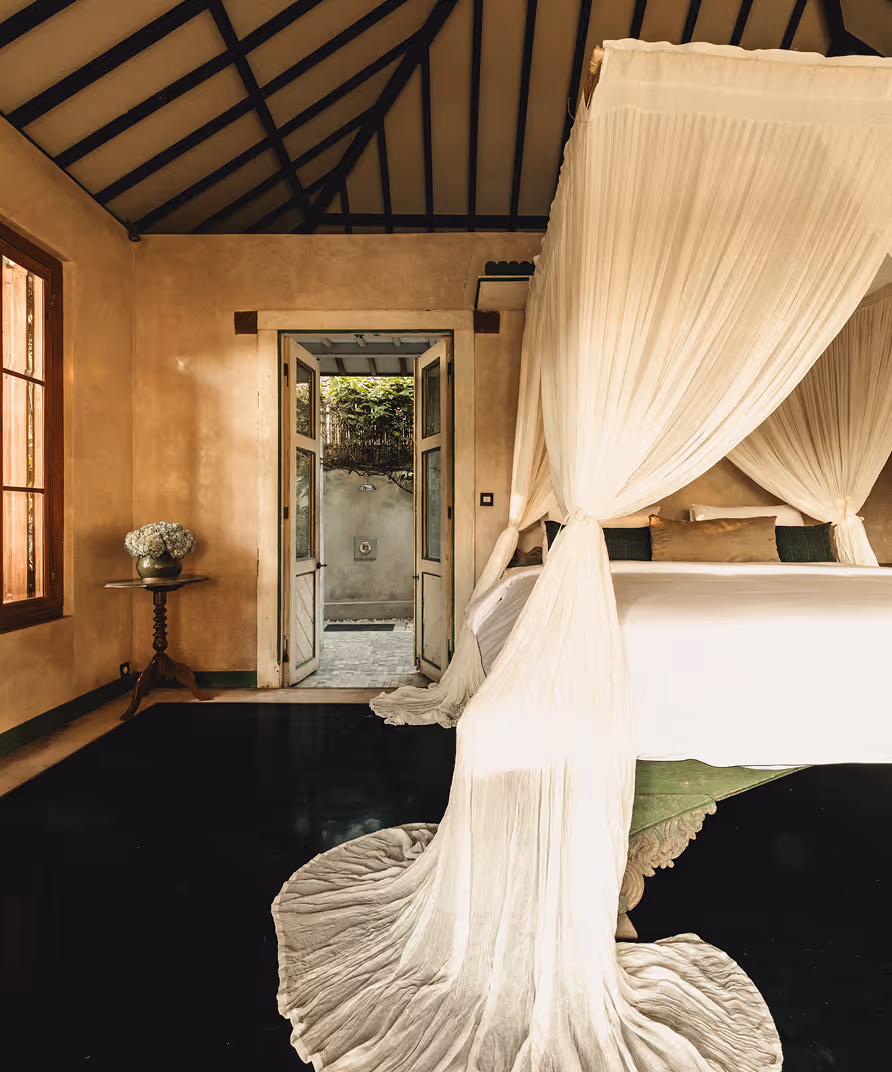 Our Master Bungalow is a private haven of space, privacy, and heritage design created by joining our two Pool Bungalows. Set around a shared pool, each bungalow includes a spacious open-air bathroom, wooden features, artisanal detailing and a four-poster bed. Ideal for families or friends, this space is a beautiful sanctuary for a meaningful and restorative time together.